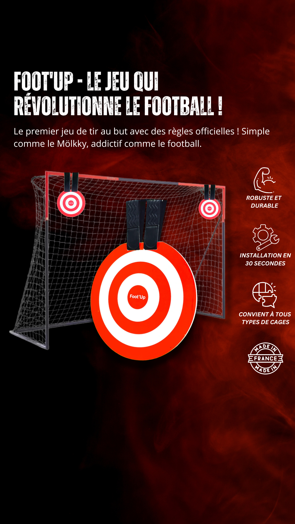 Foot'Up révolutionne les cibles foot avec le premier jeu officiel de tir au but ! Comme le Mölkky ou les fléchettes, Foot'Up a ses propres règles : 3 cibles, système de points, règle de la "remise à zéro". Fabriqué en France, installation en 30 secondes. Plus de 10 variantes de jeu possibles, résistance testée par +50 clubs. Transformez votre but en terrain de compétition !